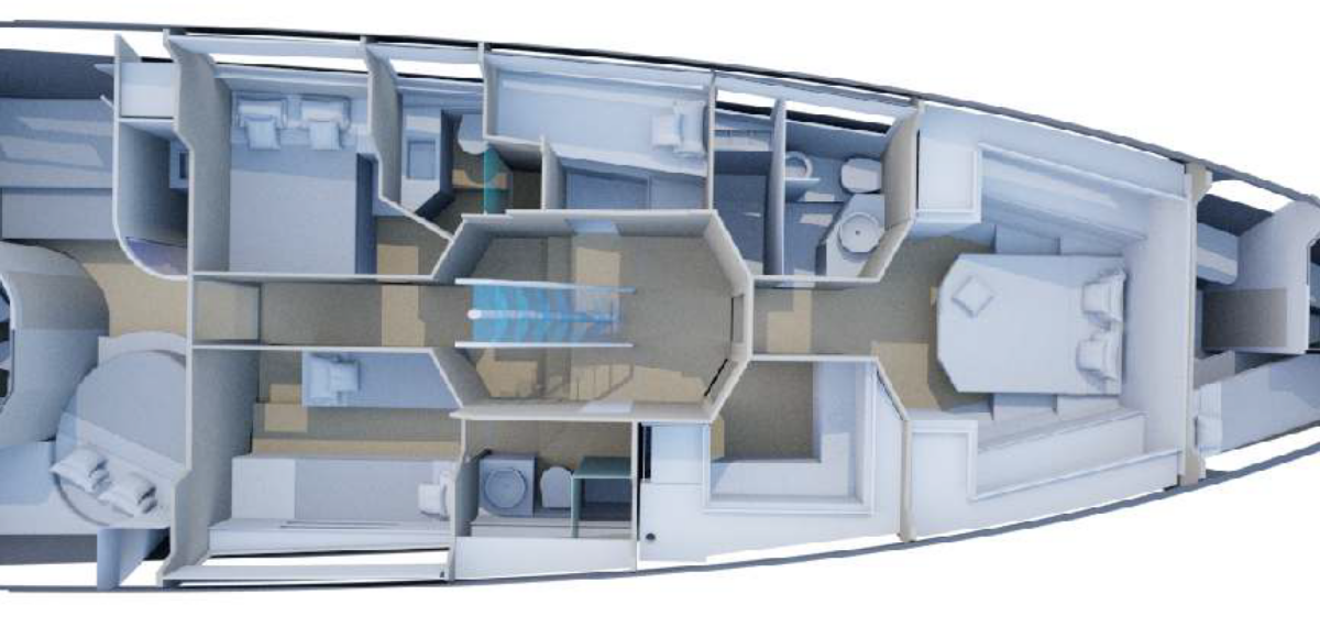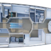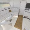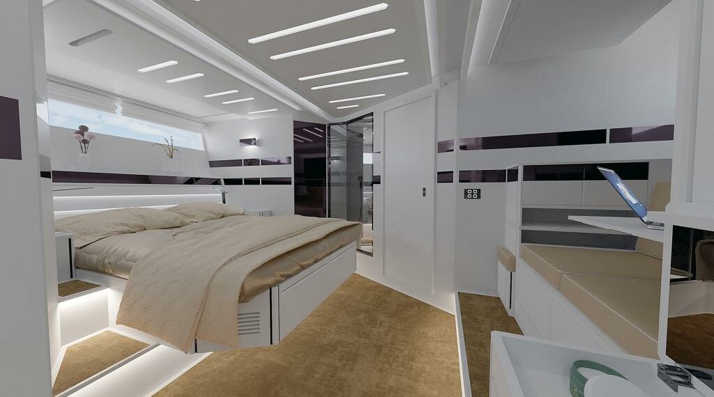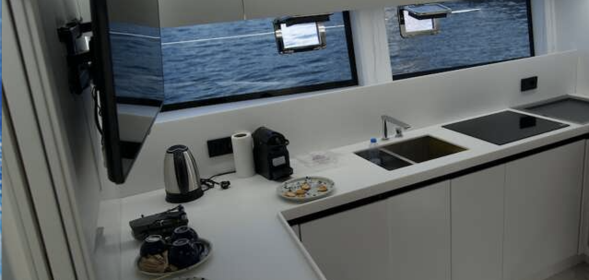 You will find a Jacuzzi in the bow in front of the impressive main deck area. Down below, you will find the spacious and purely designed accommodation area with a large galley and 3 in-suite cabins fitted with large windows giving you natural light and keeping you close to the sea in very comfortable surroundings.