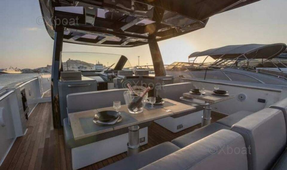 L’extérieur est doté de larges bains de soleil, d’une plateforme de bain hydraulique et d’un cockpit ouvert avec bar entièrement équipé. Parfait pour recevoir, il offre un espace convivial et luxueux.