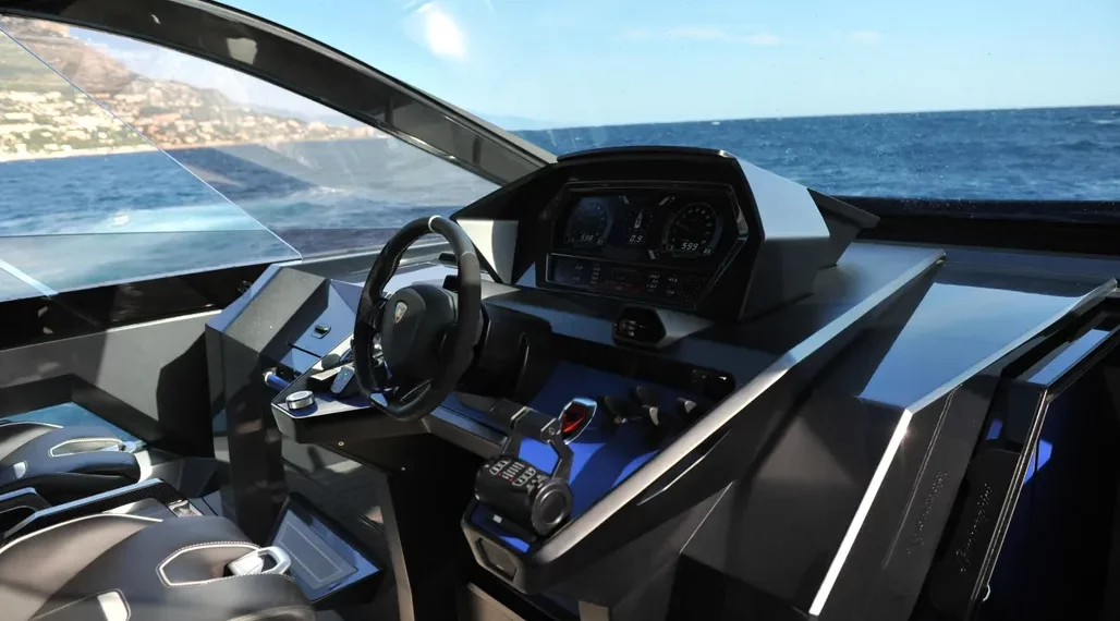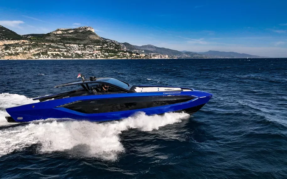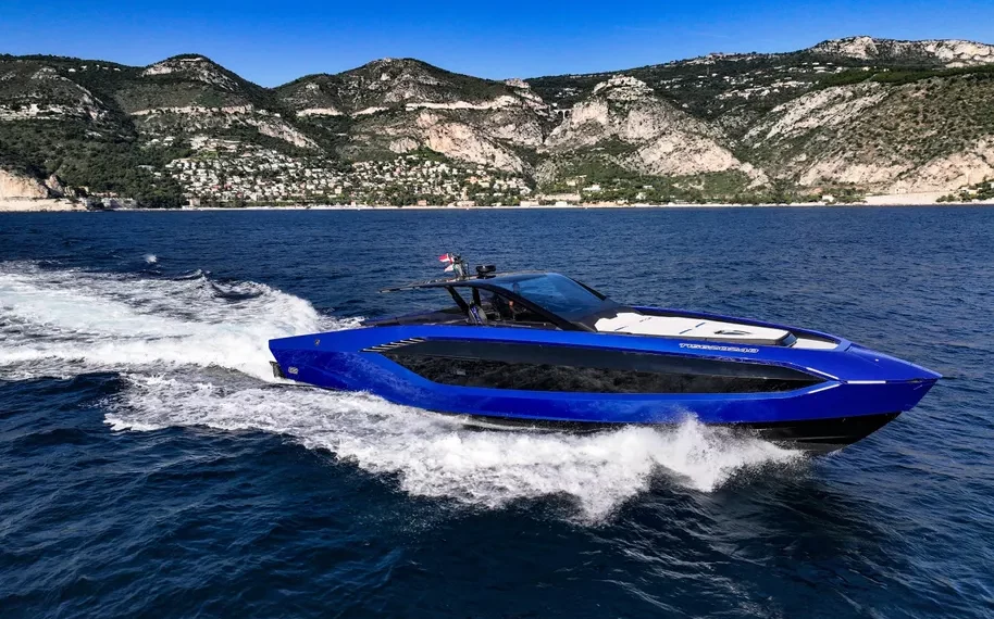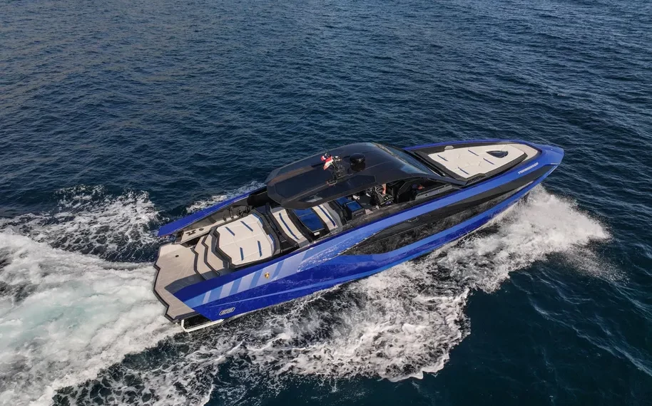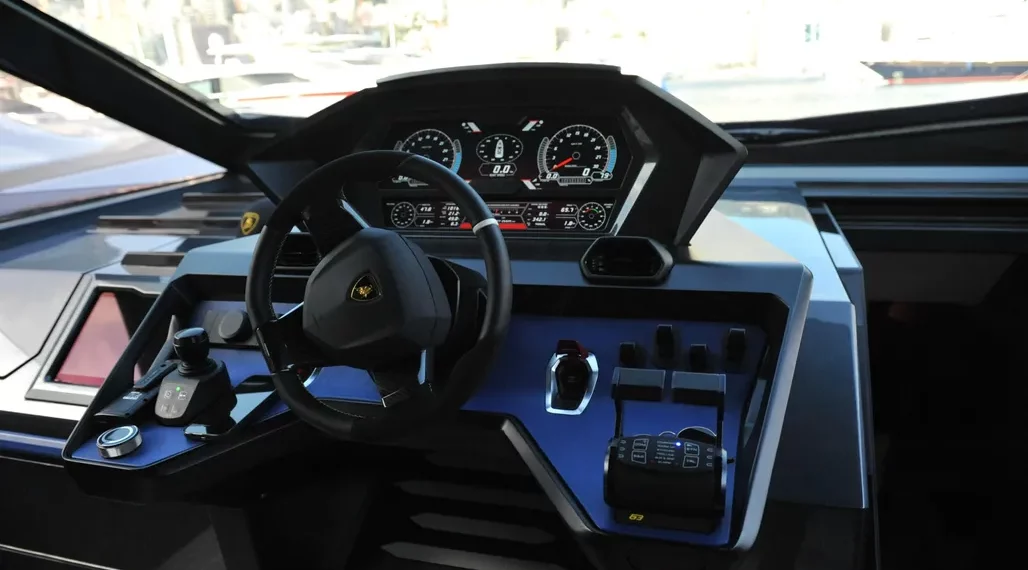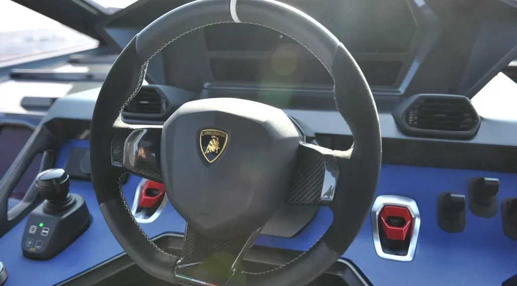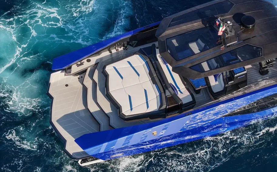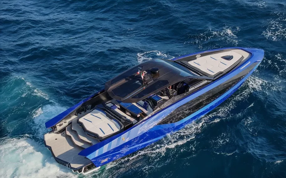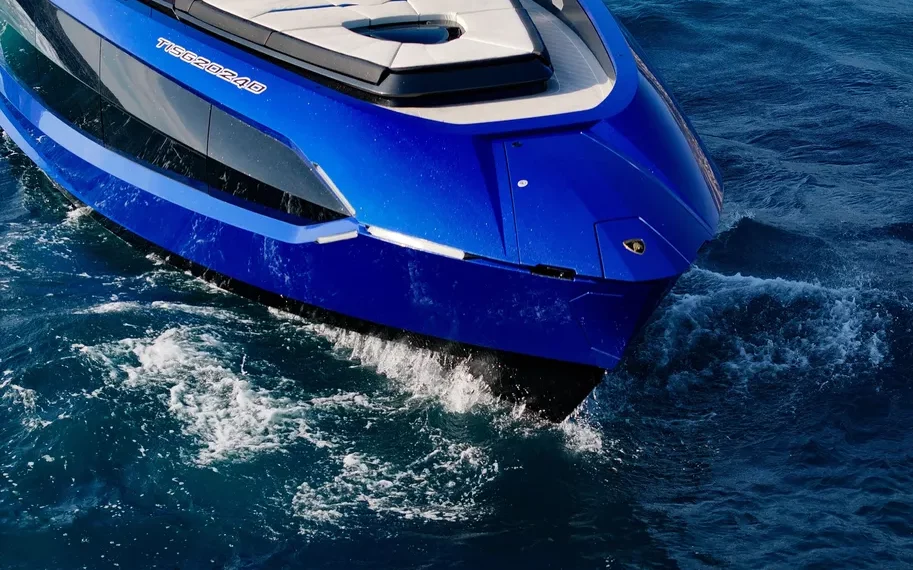 Avec ses moteurs MAN V12 de 2000HP, le yacht atteint une vitesse impressionnante de 63 nœuds. Conçu avec une coque en fibre de carbone, un matériau emblématique des voitures Lamborghini, elle se classe parmi les yachts ultralégers, avec un poids maximum de seulement 24 tonnes pour ses 63 pieds.