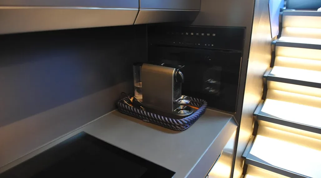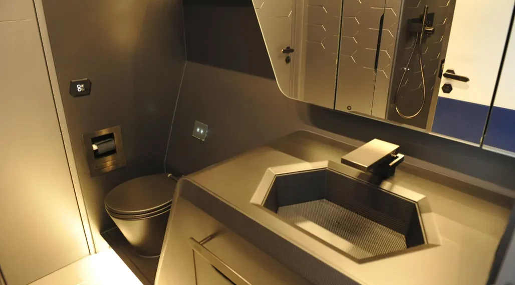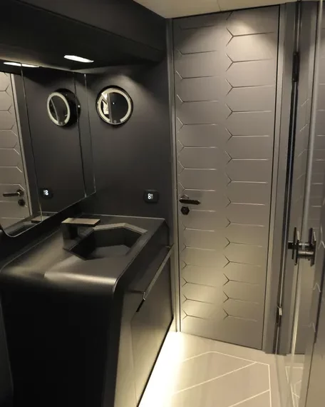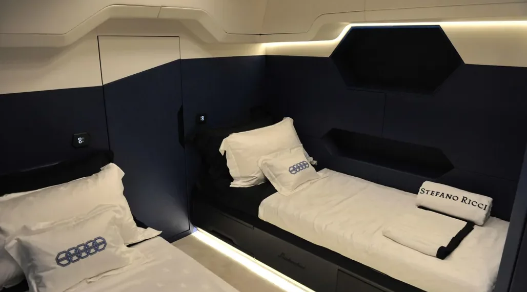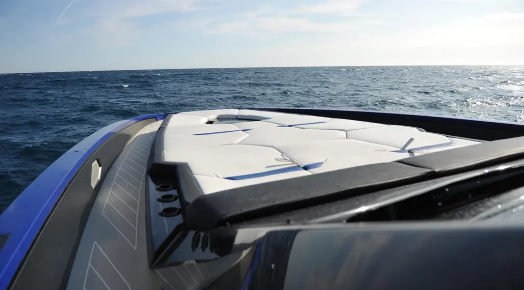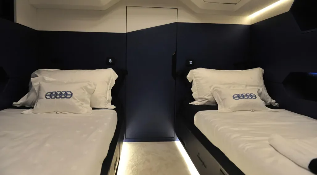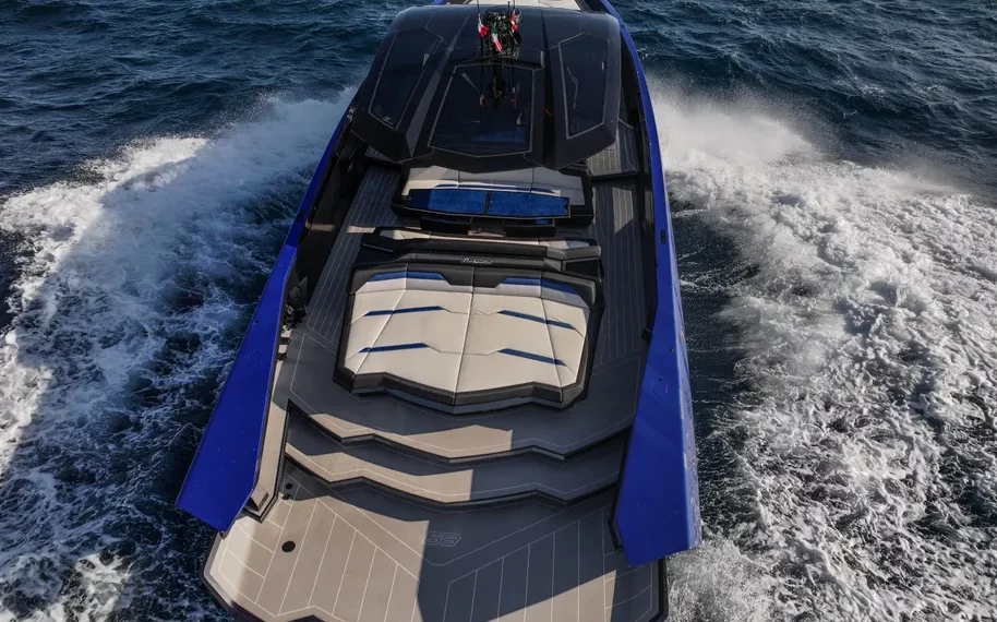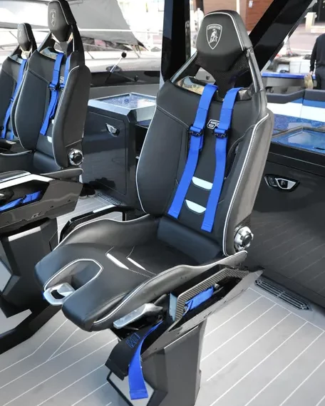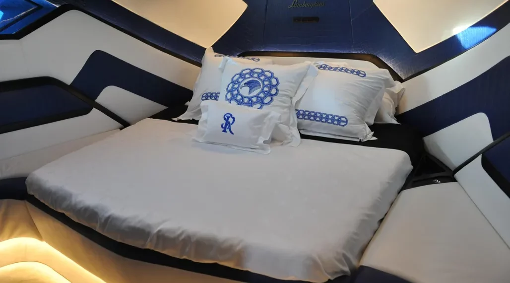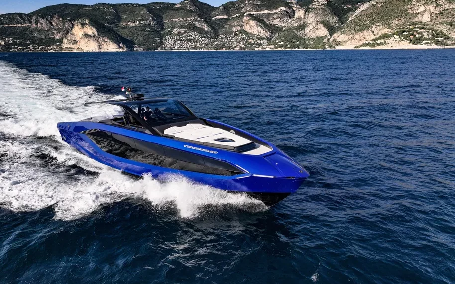 Avec ses moteurs MAN V12 de 2000HP, le yacht atteint une vitesse impressionnante de 63 nœuds. Conçu avec une coque en fibre de carbone, un matériau emblématique des voitures Lamborghini, elle se classe parmi les yachts ultralégers, avec un poids maximum de seulement 24 tonnes pour ses 63 pieds.