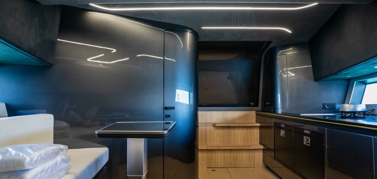 L’intérieur allie luxe et innovation, avec des finitions uniques comme un plan de travail en carbone, un lit king-size et un éclairage intégré. Le tout est protégé par un revêtement en céramique marine.