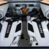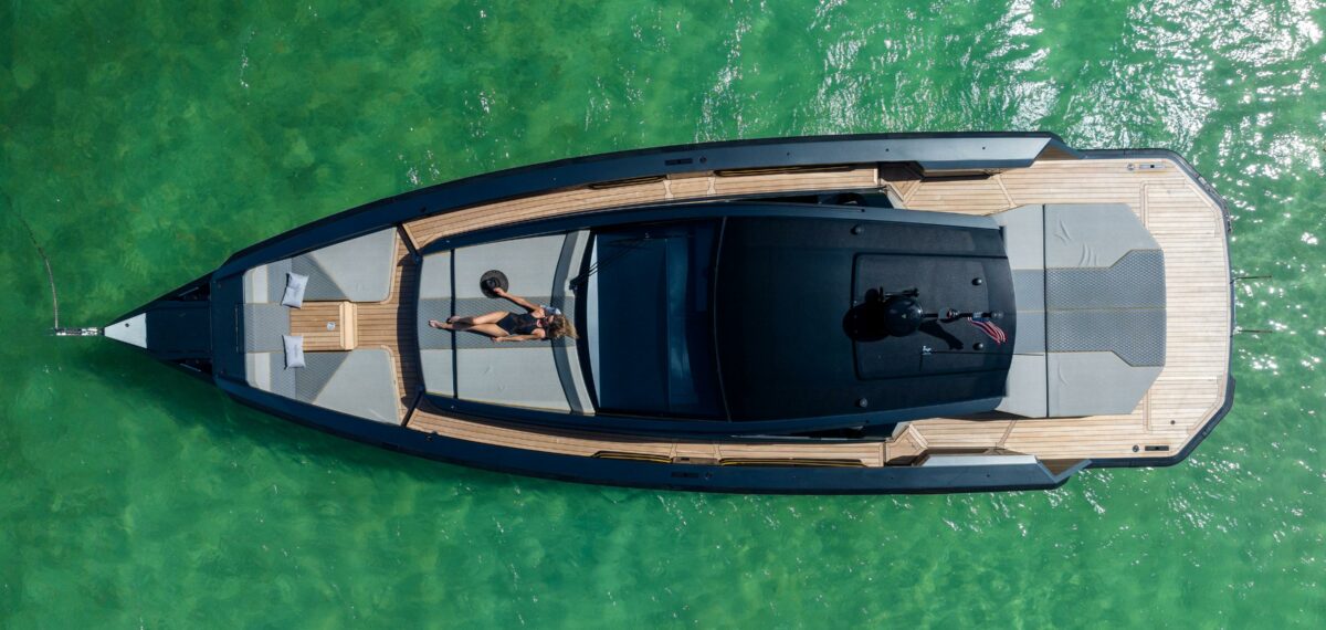 L’extérieur est pensé pour le confort, avec de grands bains de soleil avant et arrière, un pare-brise intégral, des auvents doubles, une échelle de bain hydraulique et un système sonore immersif. Le poste de pilotage comprend des sièges électriques, la climatisation et un scanneur 3D des fonds marins, parfait pour une navigation sécurisée.
