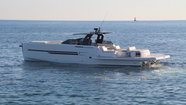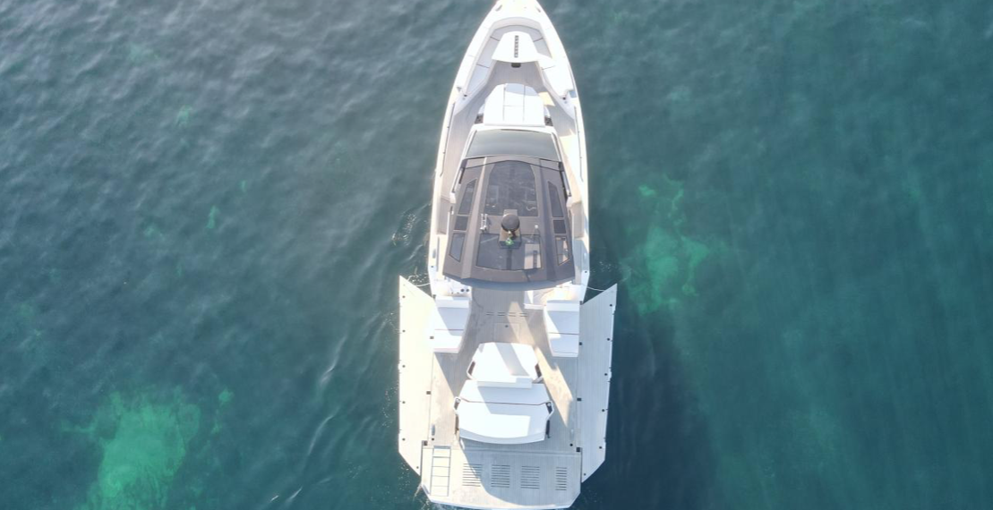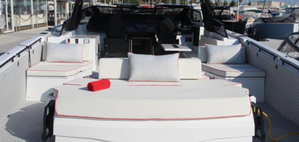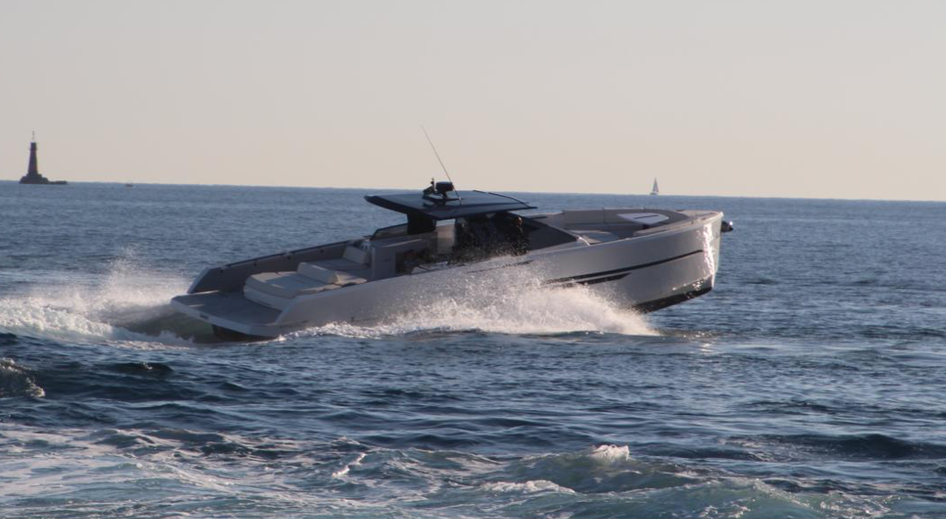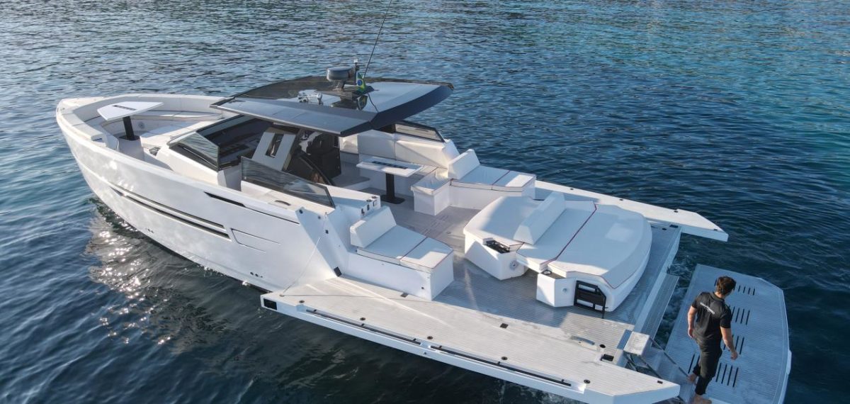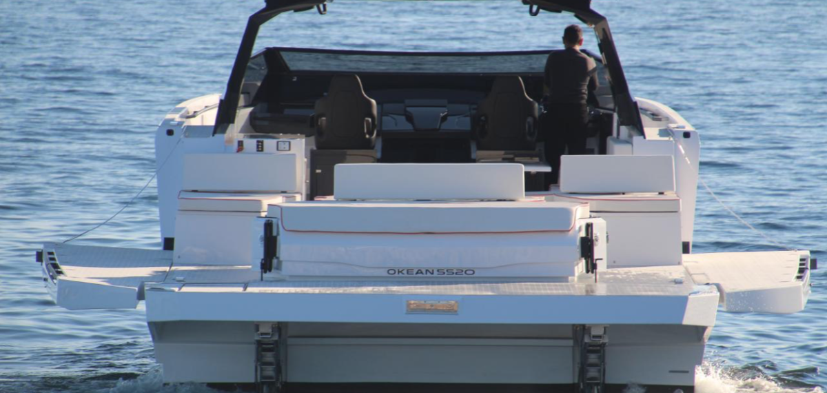The Okean 55 equipped with engines: Volvo IPS 800 600 hp, with a top speed of 35 knots; With 5 meters of beam, its straight bow has an area where it is possible to create a living environment with sofas, or leave it totally closed as a large solarium. The Okean 55´ also has side decks that open fully, guaranteeing 100 square meters of floor space.