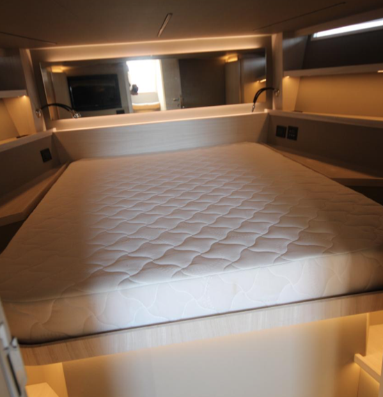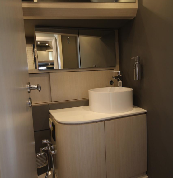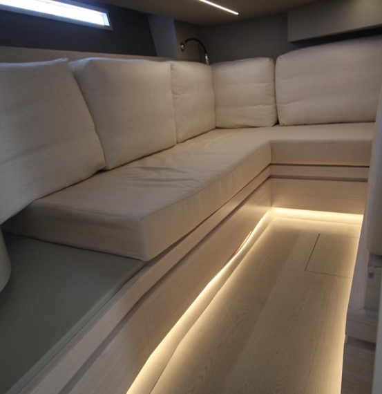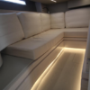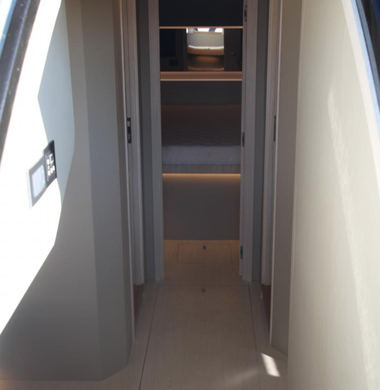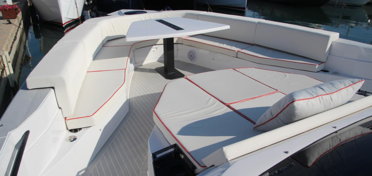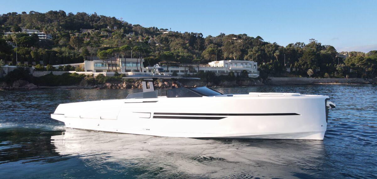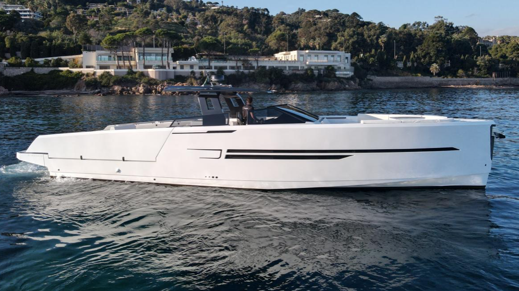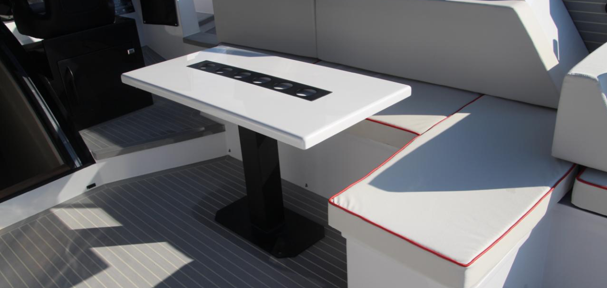 The Okean 55 equipped with engines: Volvo IPS 800 600 hp, with a top speed of 35 knots; With 5 meters of beam, its straight bow has an area where it is possible to create a living environment with sofas, or leave it totally closed as a large solarium. The Okean 55´ also has side decks that open fully, guaranteeing 100 square meters of floor space.