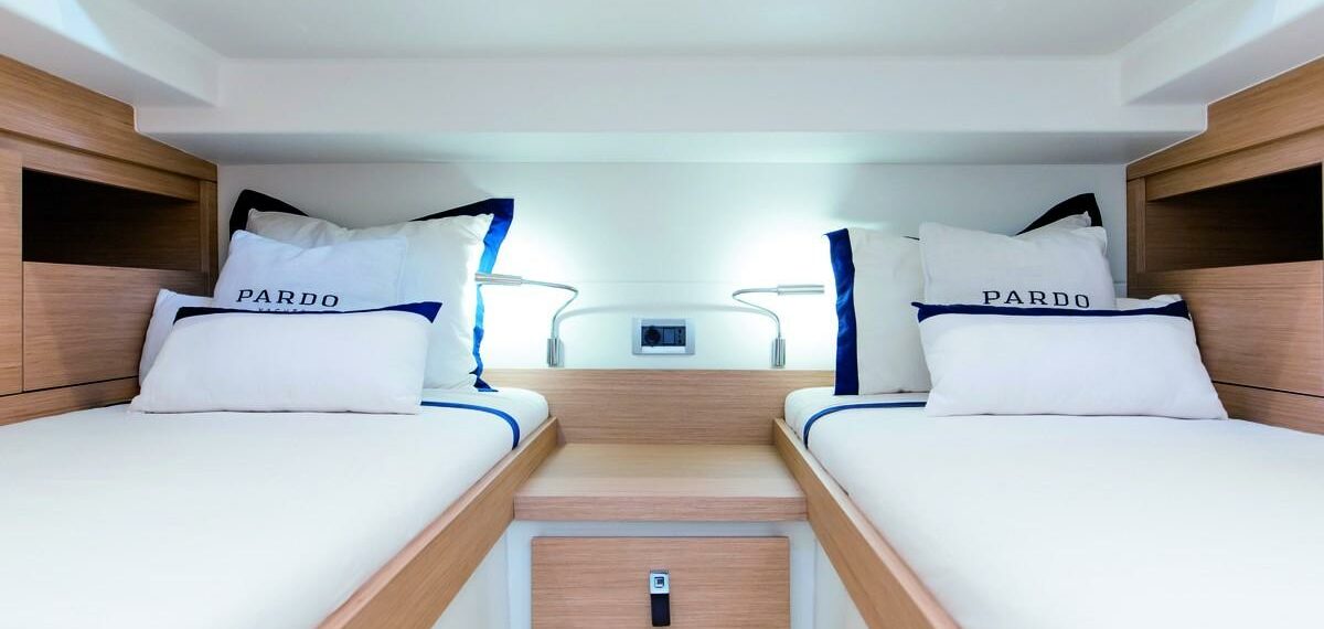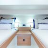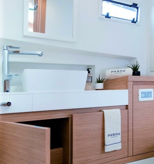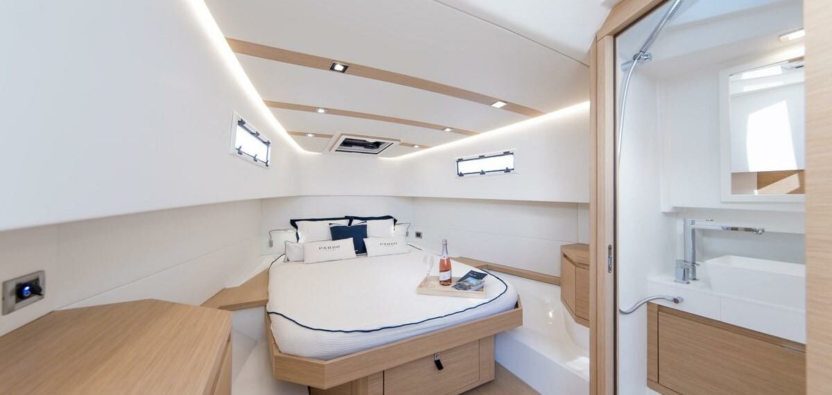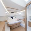 Ce modèle dispose de deux cabines raffinées et d’une salle de bain moderne avec douche séparée, optimisant l’espace pour offrir un confort à bord unique.