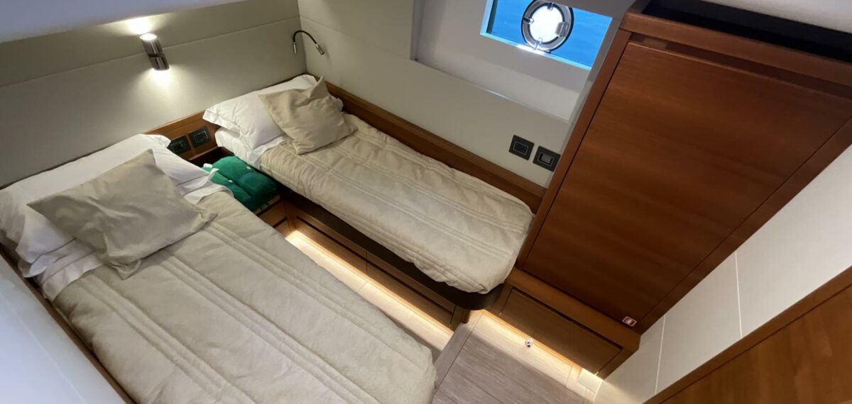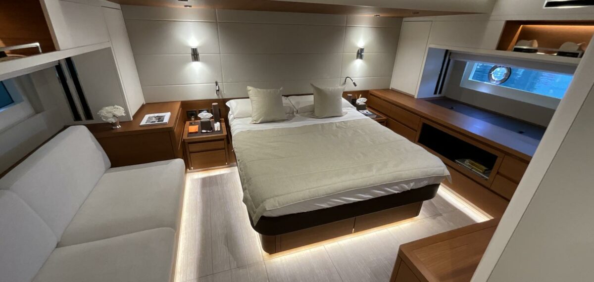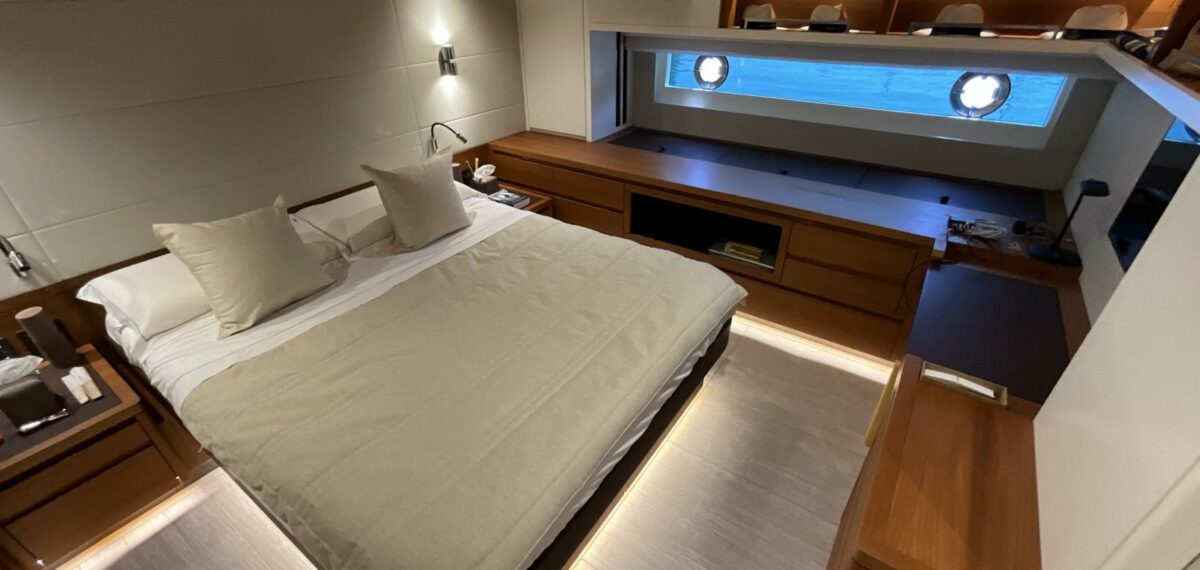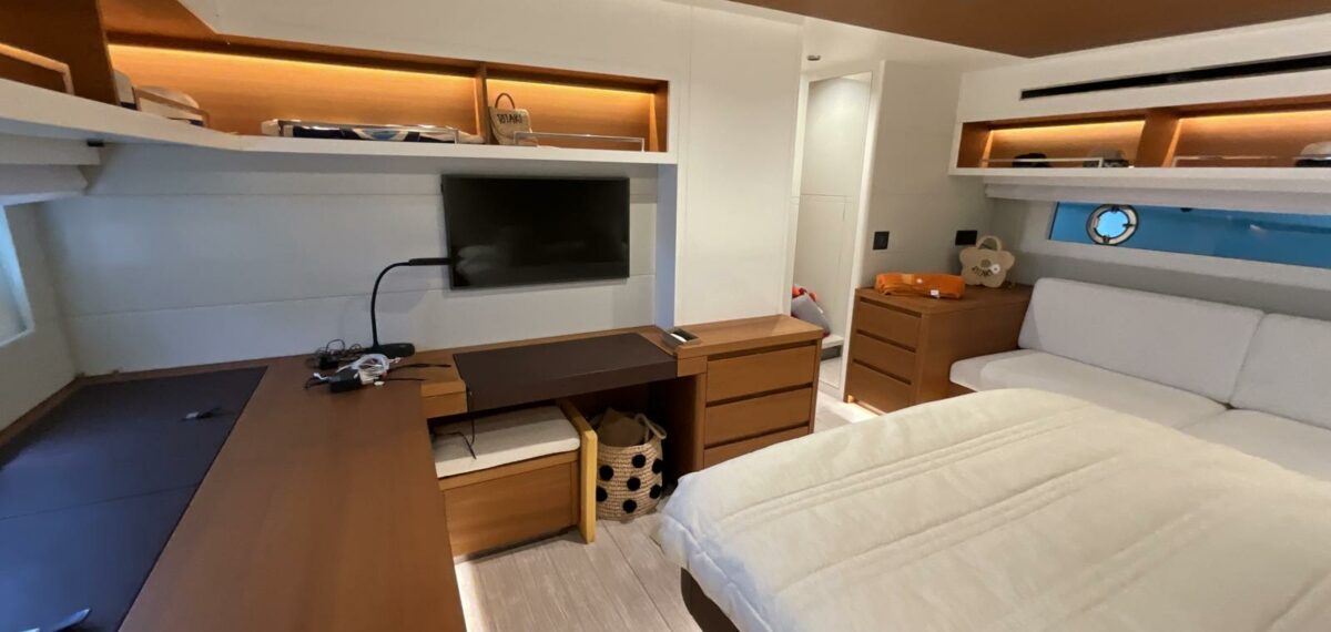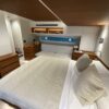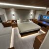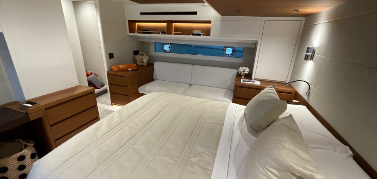 La suite principale est située au centre du bateau, exploitant toute la largeur pour offrir un espace impressionnant, offrant ainsi un confort incomparable. Le cabine d’équipage, accessible depuis le pont arrière, est équipée de deux lits, d’une salle de bain et d’un accès direct à la salle des machines, permettant de garantir une expérience fluide et sans souci pendant vos croisières.