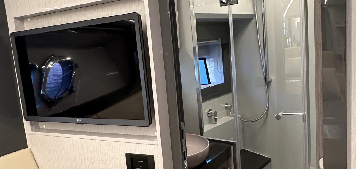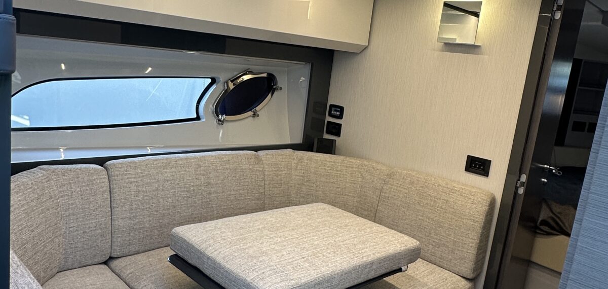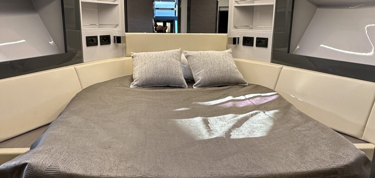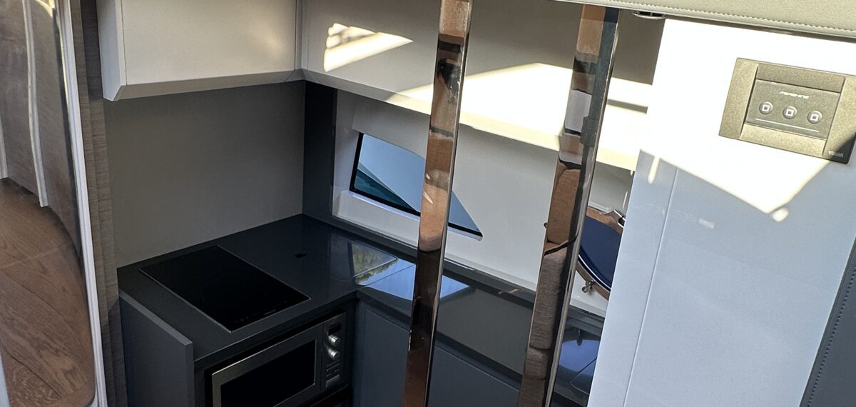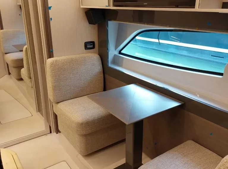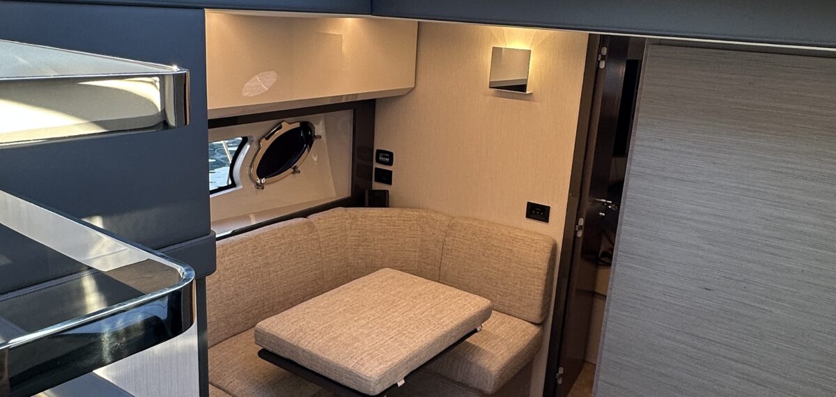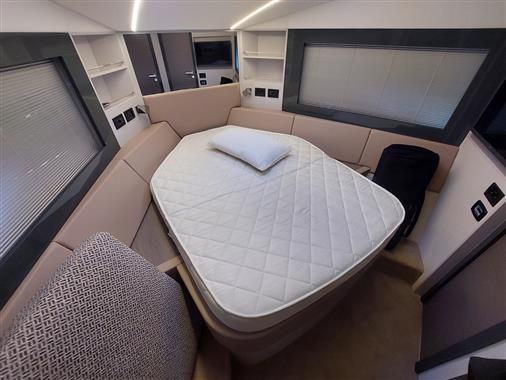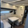 Ce yacht est pensé pour des escapades parfaites grâce à ses 2 cabines et 2 salles de bain. La cabine VIP située à l’arrière est équipée d’un lit double, d’une salle d’eau privative et de nombreux rangements. La cabine avant dispose de deux lits jumeaux transformables, accompagnés également d’une salle de bain attenante. La cuisine spacieuse, en contrebas, est équipée d’une plaque à induction, d’un réfrigérateur et d’un évier, idéale pour vos moments gourmands en mer. Le salon lumineux et convivial offre un grand canapé en L et une dinette, parfaits pour des moments de détente ou de partage entre amis et en famille.