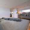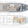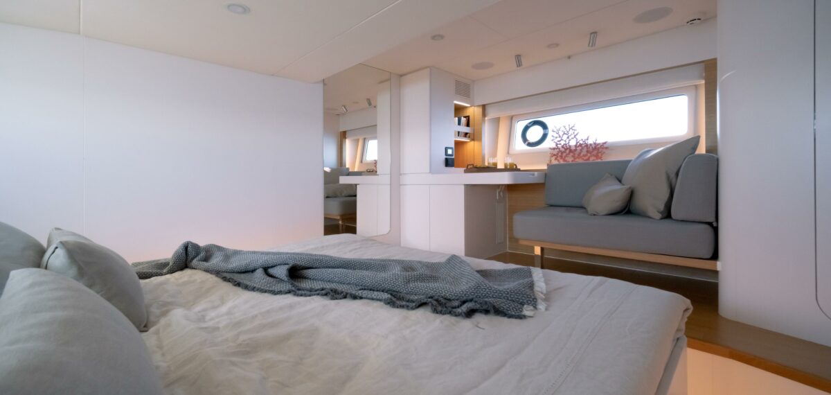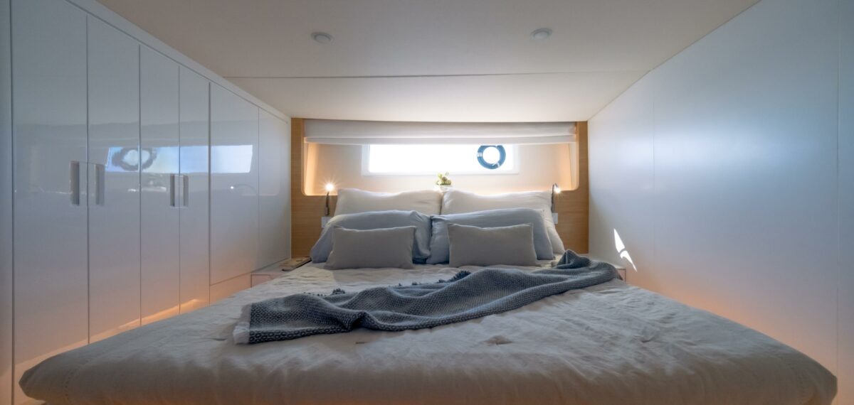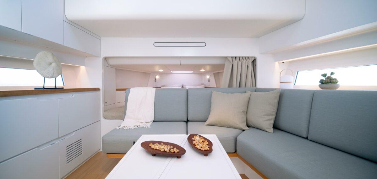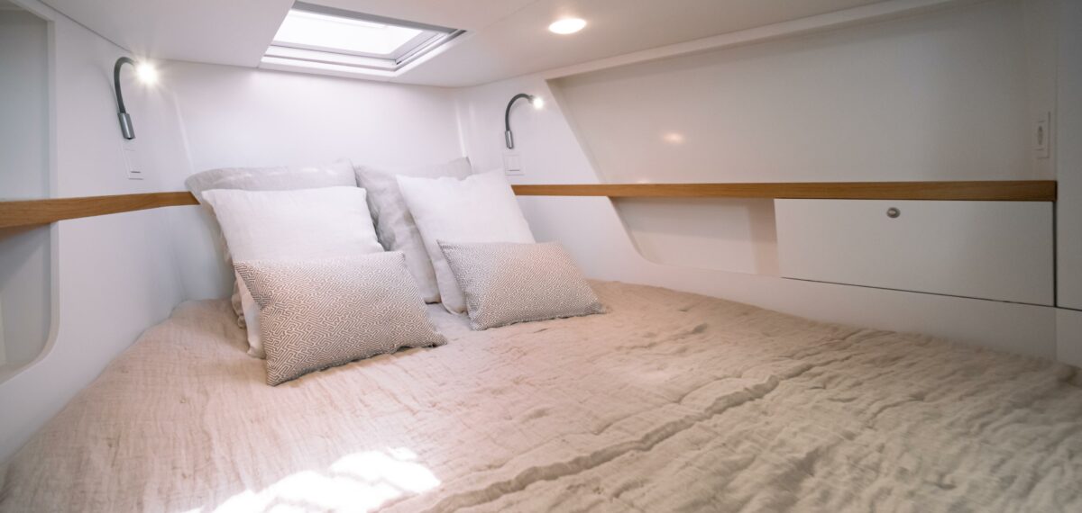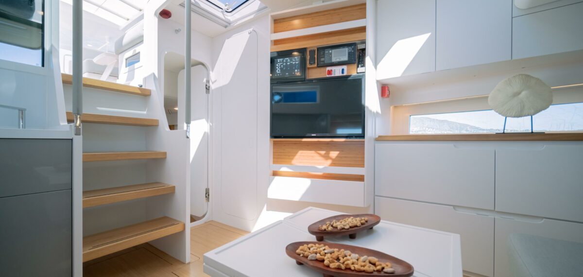 À l’intérieur, le yacht dispose d’un grand salon moderne, d’une cuisine, d’une salle d’eau avec douche à l’italienne et de couchages pour 4 personnes dans la proue, ainsi que d’une cabine propriétaire pleine largeur à l’arrière.