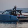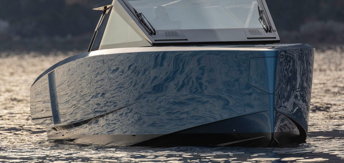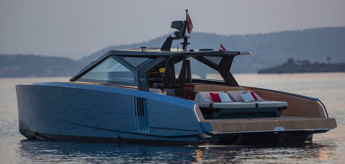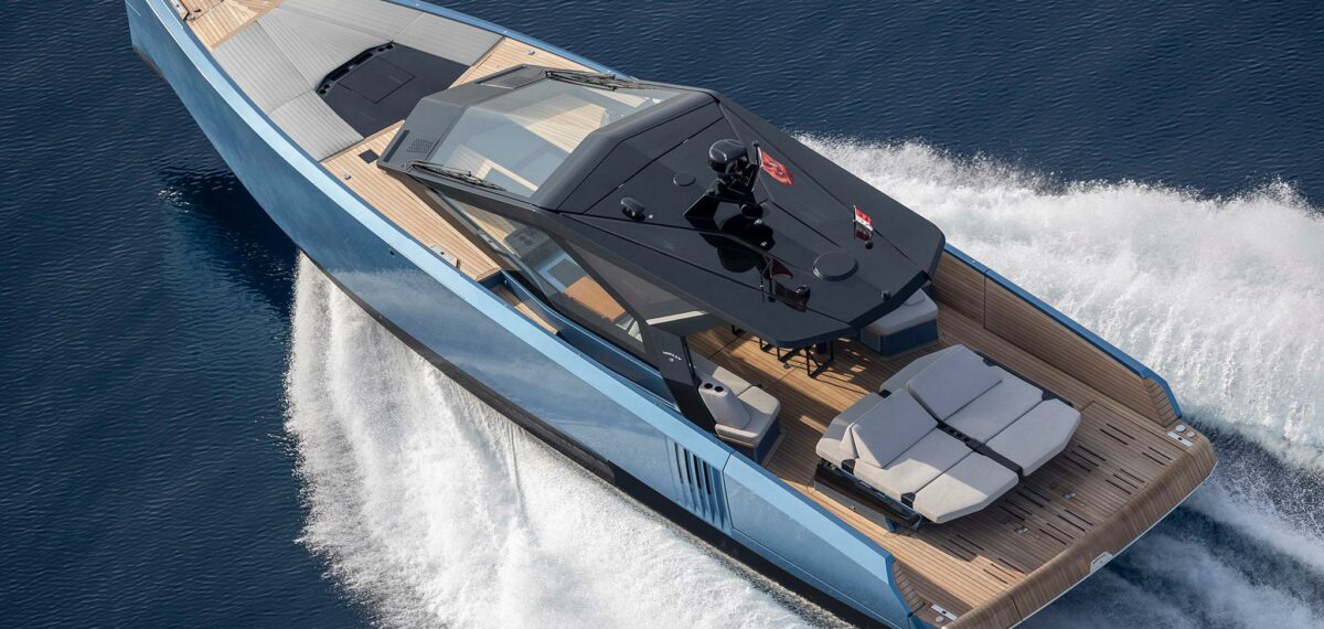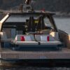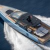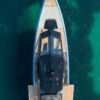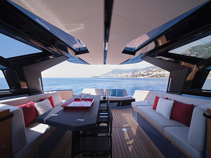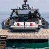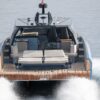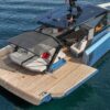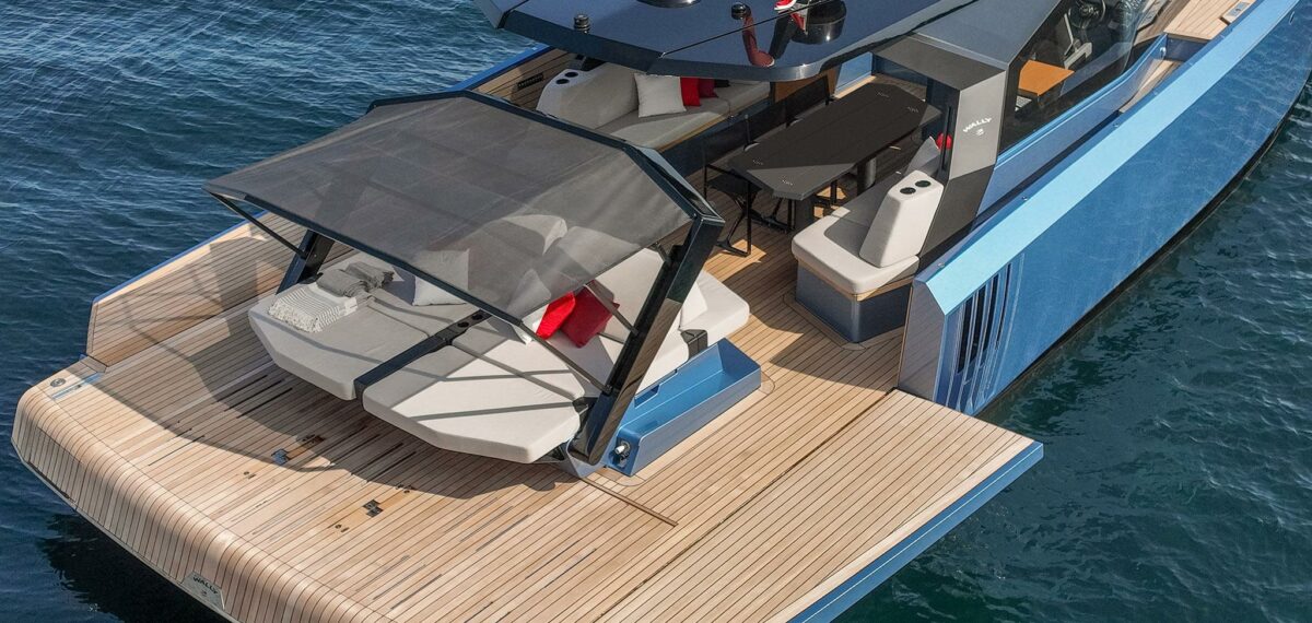 Ce yacht arbore une coque et un pont peints dans une teinte métallisée bleu glacé, associés à un pont en teck avec des joints gris clair pour une esthétique raffinée. La zone arrière offre un espace généreux avec un auvent électrique protégeant le bain de soleil et la zone repas, soutenu par des poteaux en carbone amovibles. La plateforme arrière est équipée d’un système hydraulique pour lever et abaisser l’annexe, avec berceaux rétractables conçus pour un Williams Turbojet 325.