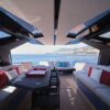L’intérieur bénéficie d’un confort supérieur grâce à une climatisation améliorée, un gyrostabilisateur Seakeeper 9 et une connexion Internet 4G renforcée. Pour les équipements pratiques, le yacht dispose d’un dessalinisateur produisant 130 litres par heure, d’un générateur de 15 kW, d’une fabrique de glace sur le pont avec réservoir indépendant et de nombreux espaces de réfrigération supplémentaires.
